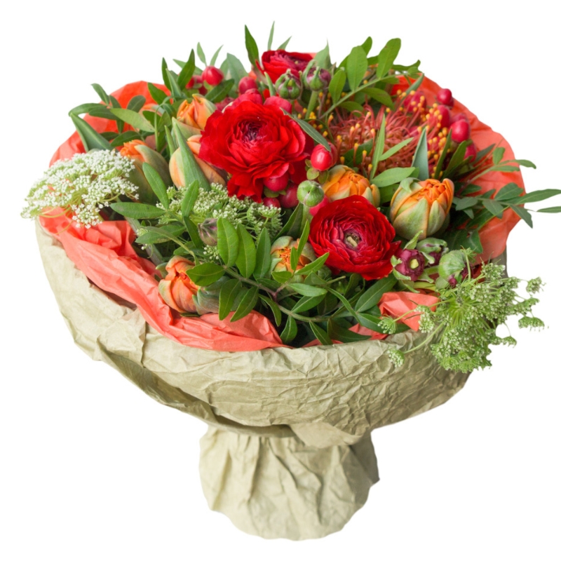 Букет состоит из 3 ранункулюса, 9 тюльпанов, 3 ветки гиперикума, 5 амми, 1 леукоспермум, зелень, крафт, атласная лента.