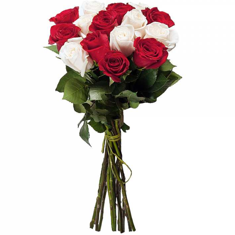 Букет состоит из 10 красных роз, 9 белых роз, прозрачная упаковка, атласная лента.
