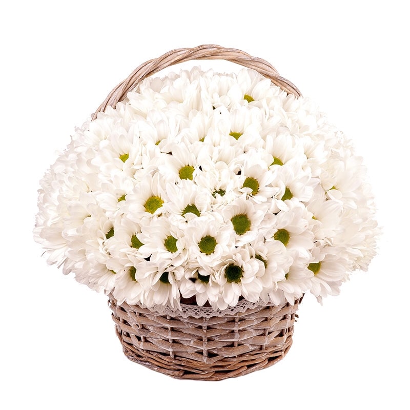 Букет состоит из 25 веток белых ромашковых хризантем, корзина, атласная лента.